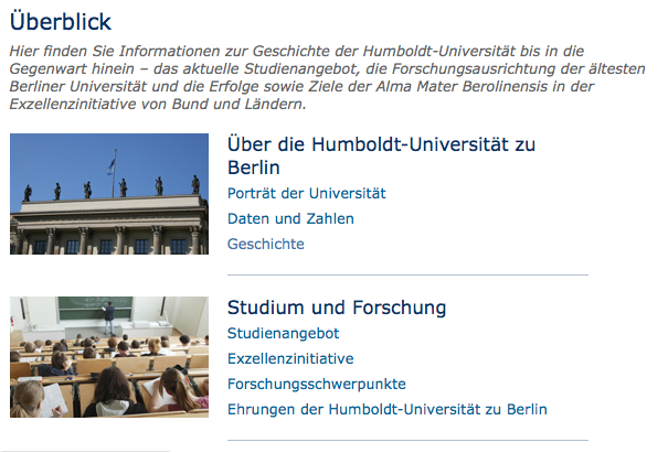 - Links zu Unterseiten werden mit ?berschrift, Teaser und Bild angezeigt.