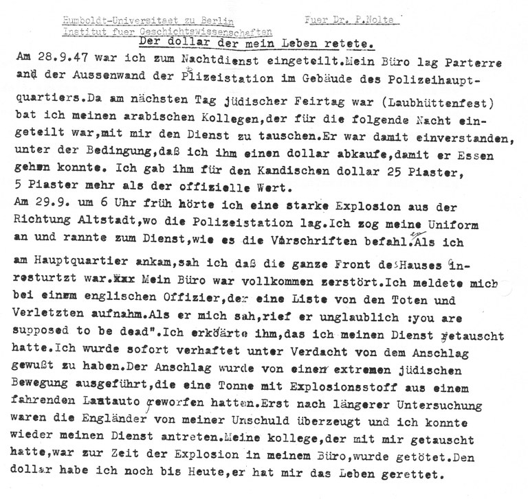 Yehuda Berthold Benski (1913-2001) wurde wegen seiner linken Einstellung 1933 aus der Berliner Universit?t geworfen. Er wanderte nach Pal?stina aus und machte Karriere zun?chst in der britischen, dann in der israelischen Polizei. Seine Mutter und Schwester, die in Deutschland geblieben waren, wurden nach Auschwitz deportiert und ermordet.