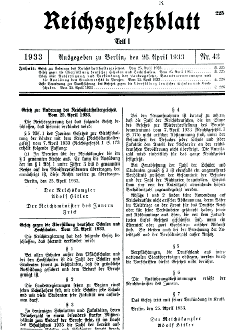 "Gesetz gegen die ?berfüllung der deutschen Schulen und 金贝棋牌n" vom 25. April 1933