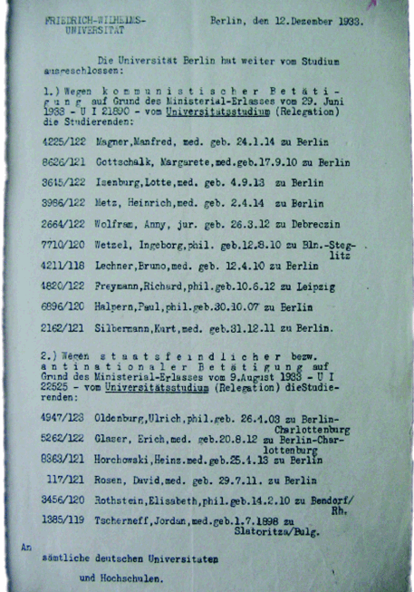 "Wegen staatsfeindlicher Gesinnung von den 金贝棋牌n gewiesene Studierende" an der Universit?t Berlin